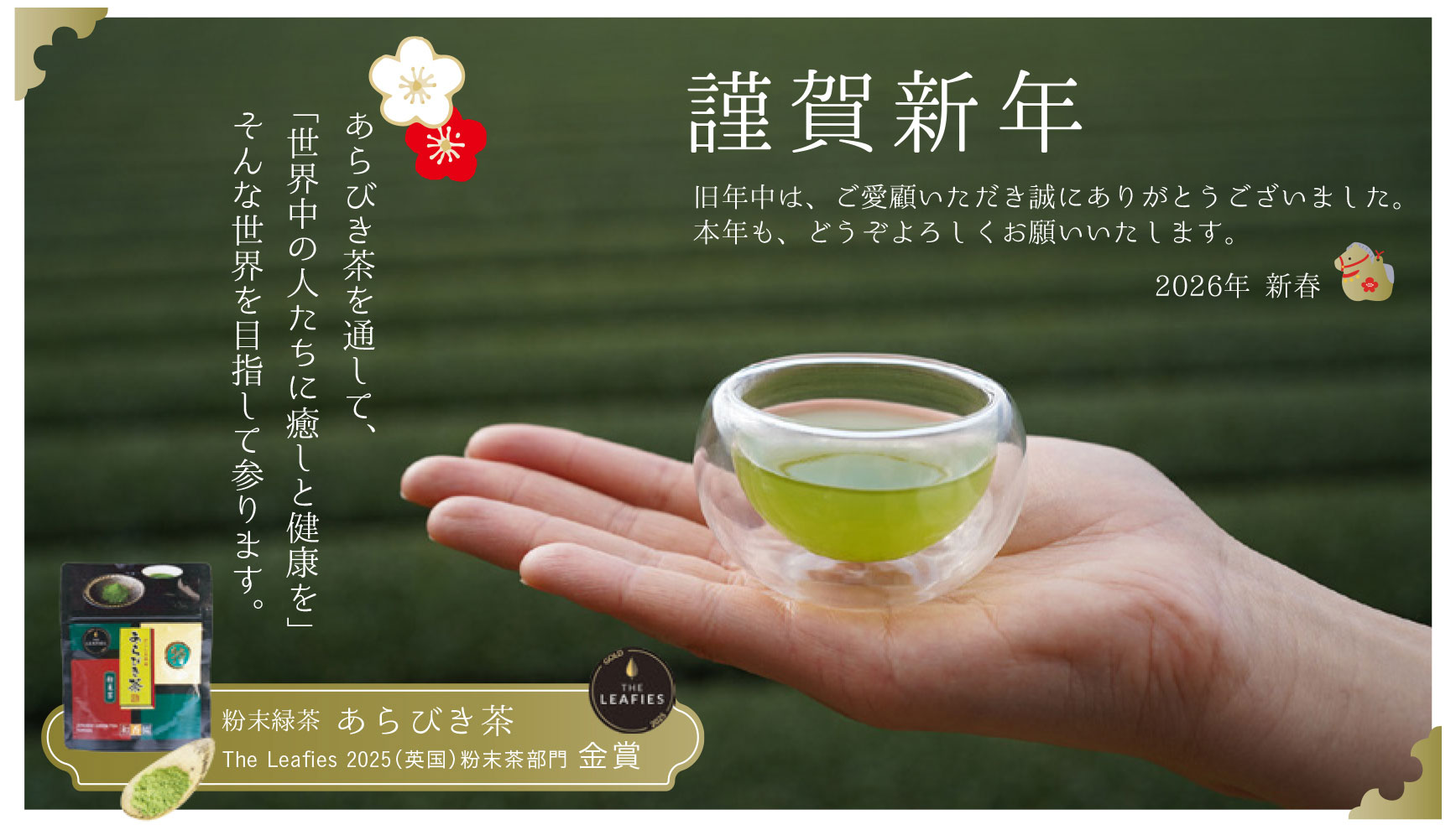 お知らせ 2026年 新年のご挨拶 2026.01.01 皆様、明けましておめでとうございます。 謹んで新春のお慶びを申し上げます₊✽୭ 本年もお茶を通じて、皆様に健康と笑顔をお届けして参ります。 2026年も宜しくお願い申し上げます.。:+* ゚